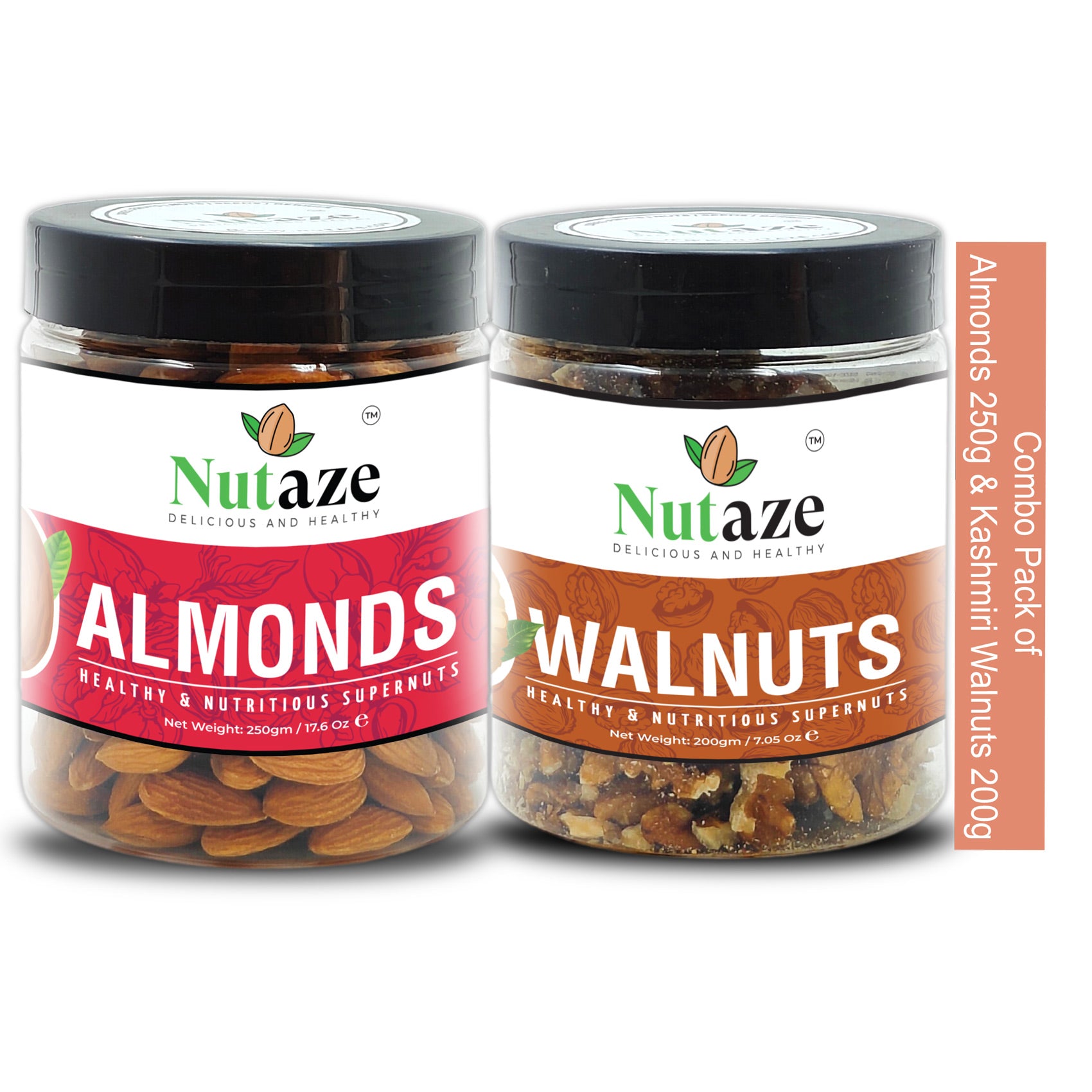 Nutaze Combo Pack of Premium Almonds 250g & Kashmiri Walnut Kernels 200g | 100% Authentic | 100% Natural