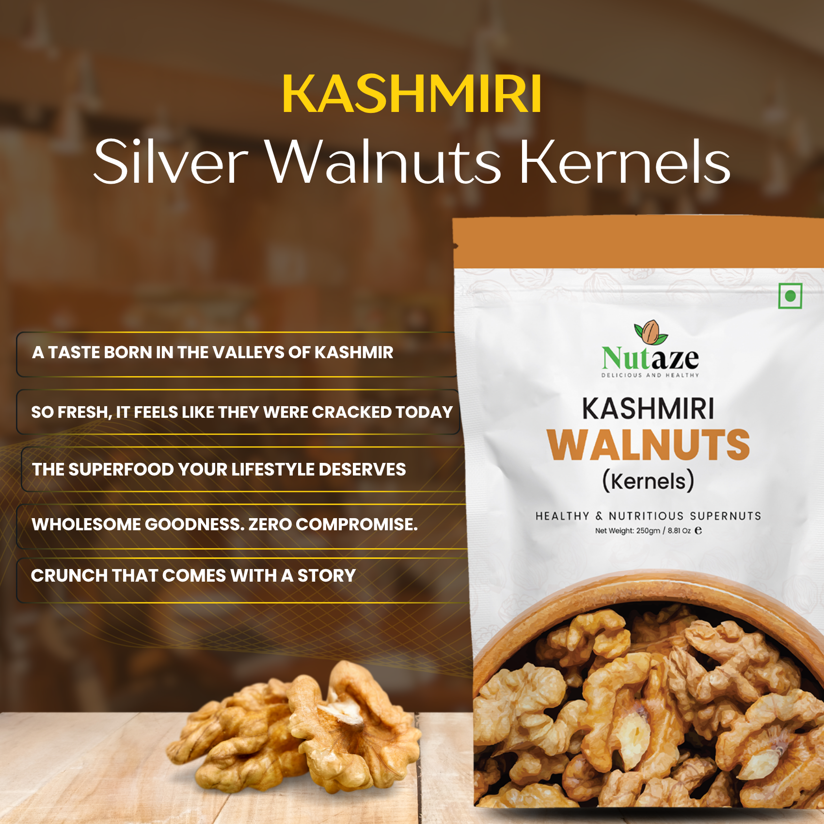 Nutaze Kashmiri Silver Walnuts Kernels are premium, hand-selected walnuts sourced from the finest orchards of Kashmir. Known for their silver-golden color, mild taste, and exceptional crunch, these walnuts are packed with Omega-3 fatty acids, antioxidants, plant protein, and essential vitamins.
